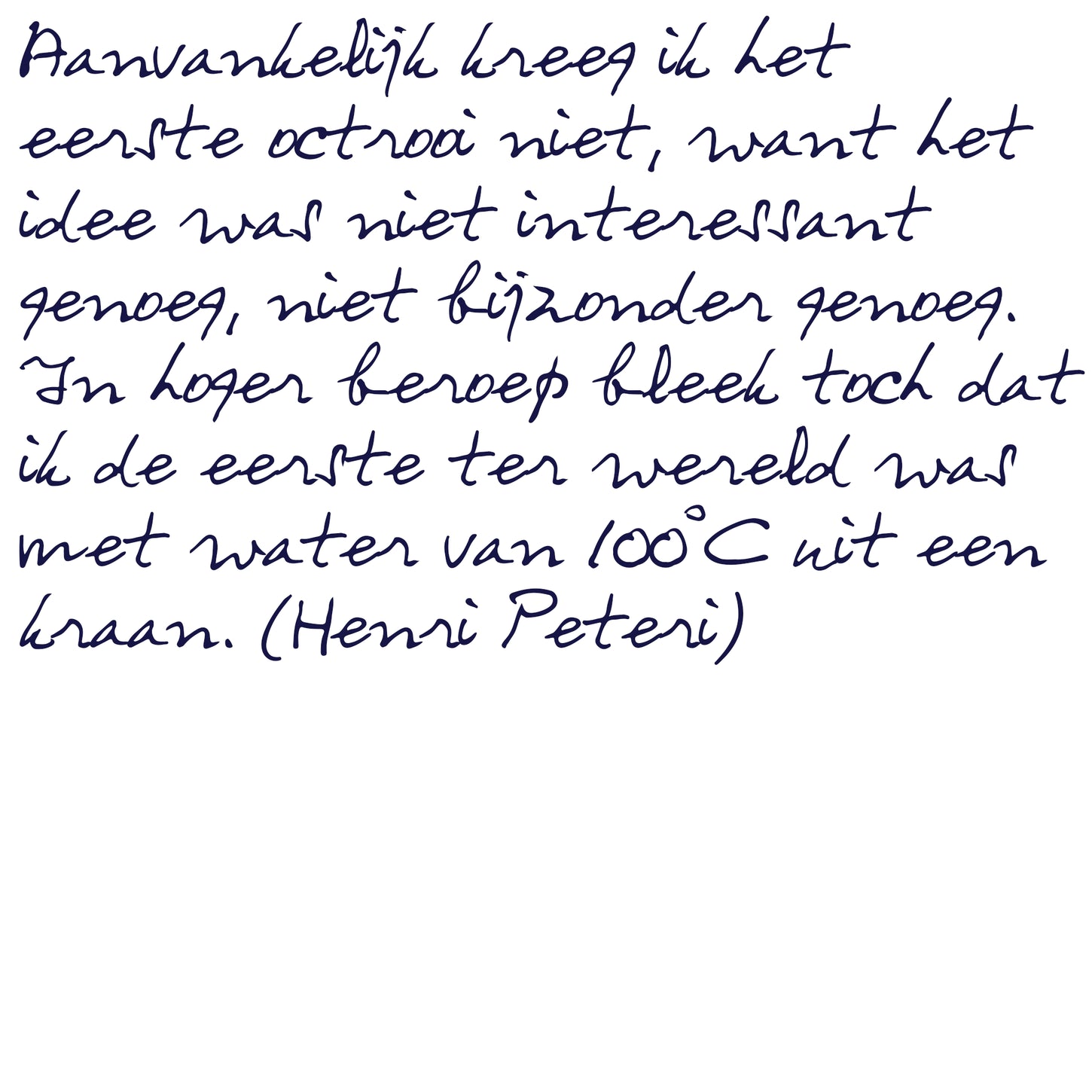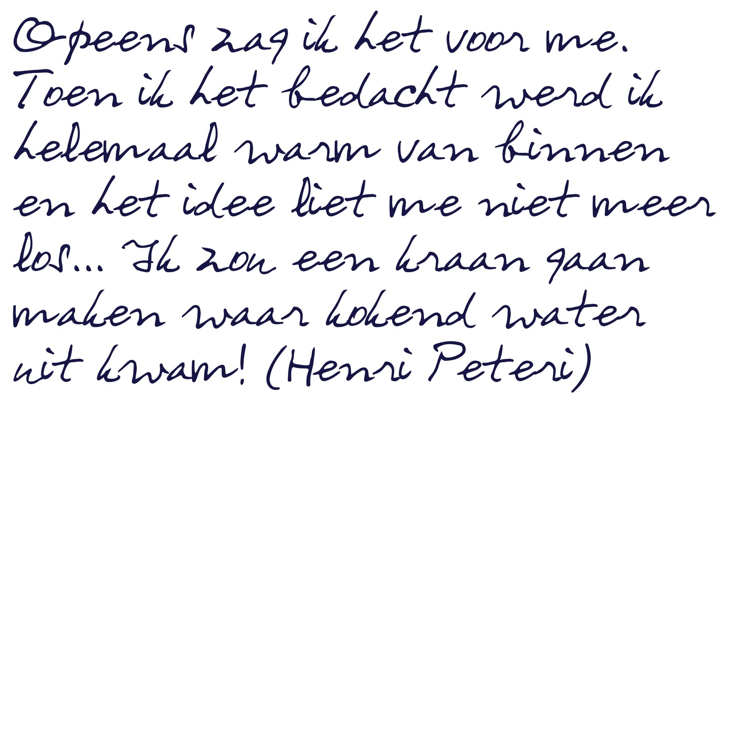 Het verhaal van Quooker is begonnen in 1970. De Rotterdamse Henri Peteri werkte bij Unilever en was op het hoofdkantoor in Londen, toen hij een ingeving kreeg die zijn leven voorgoed zou veranderen. Het was tijdens een presentatie over instant soep. Er werd getoond hoe je in slechts vijf seconden soep kon oplossen in kokend water. ‘En daar moet water bij dat vijf minuten op het vuur moet staan?’ dacht Peteri, ‘Wat een waanzin! Waarom komt er in onze huizen geen gekookt water uit de mengkraan?!’ Eenmaal thuis dook Peteri de kelder in om een prototype te ontwikkelen van de eerste kokendwaterkraan ter wereld. Dat kostte veel tijd en geld. Maar toen het eerste model er was, verkocht Peteri hem aan vrienden en bekenden, die razend enthousiast waren. Wie eenmaal een Quooker-systeem had, kon niet meer zonder.Toen zoon Niels zijn studie voltooid had en zich bij zijn vader voegde, werd het idee een product. In 1992 werd de eerste Quooker (‘quick cooker’) geïntroduceerd, de Quooker Basic. Vanaf het moment dat ook zoon Walter in het bedrijf stapte, begon Quooker langzaam maar zeker terrein te winnen op de markt. Vanaf 2000 begon het écht goed te gaan. De kokendwaterkraan sloeg aan in Nederland. In 2004 werd de eerste partij Quookers naar het buitenland geëxporteerd.